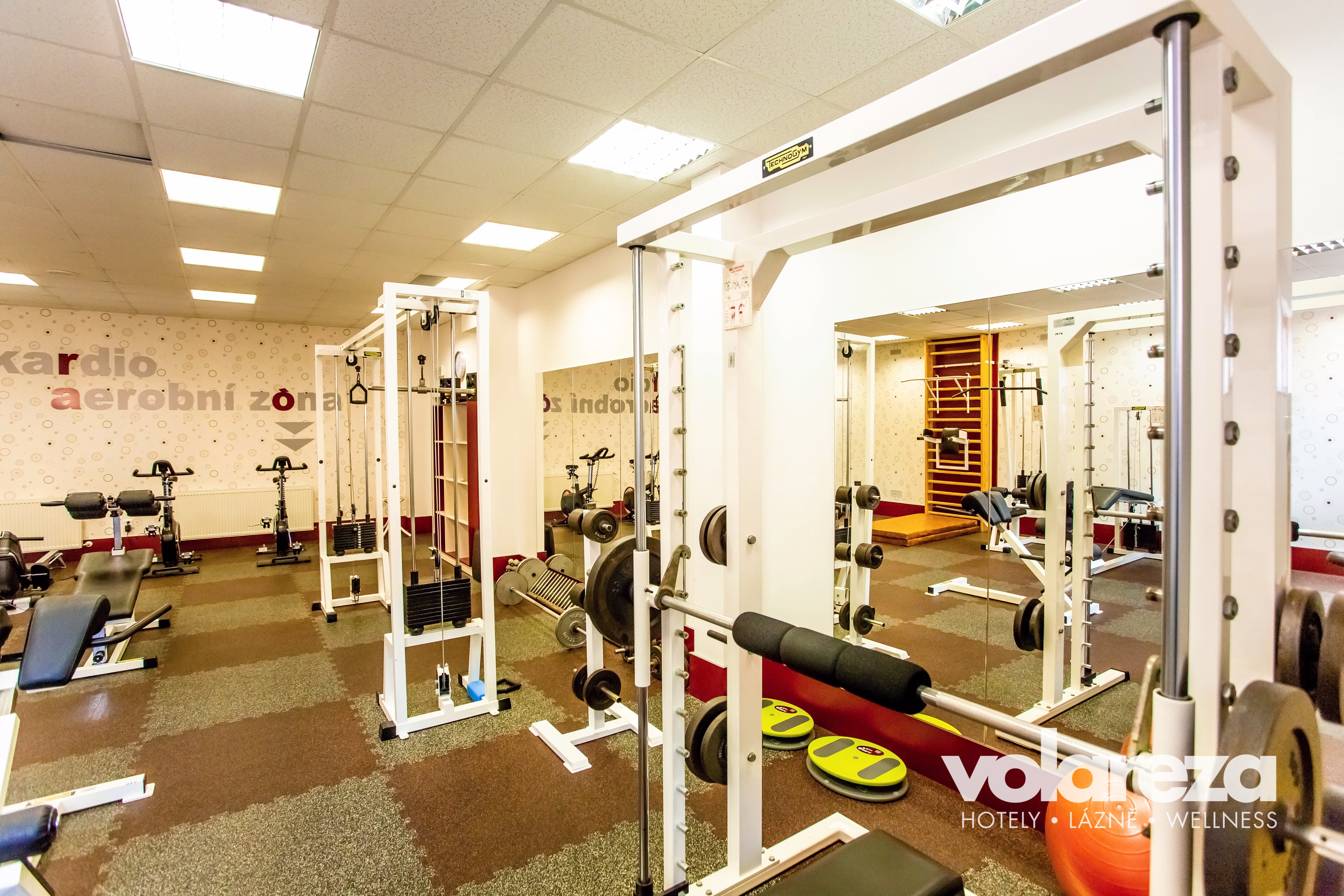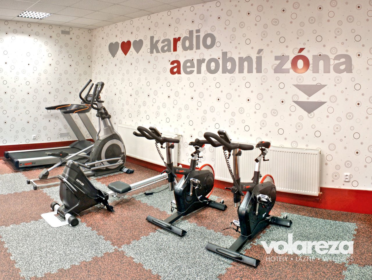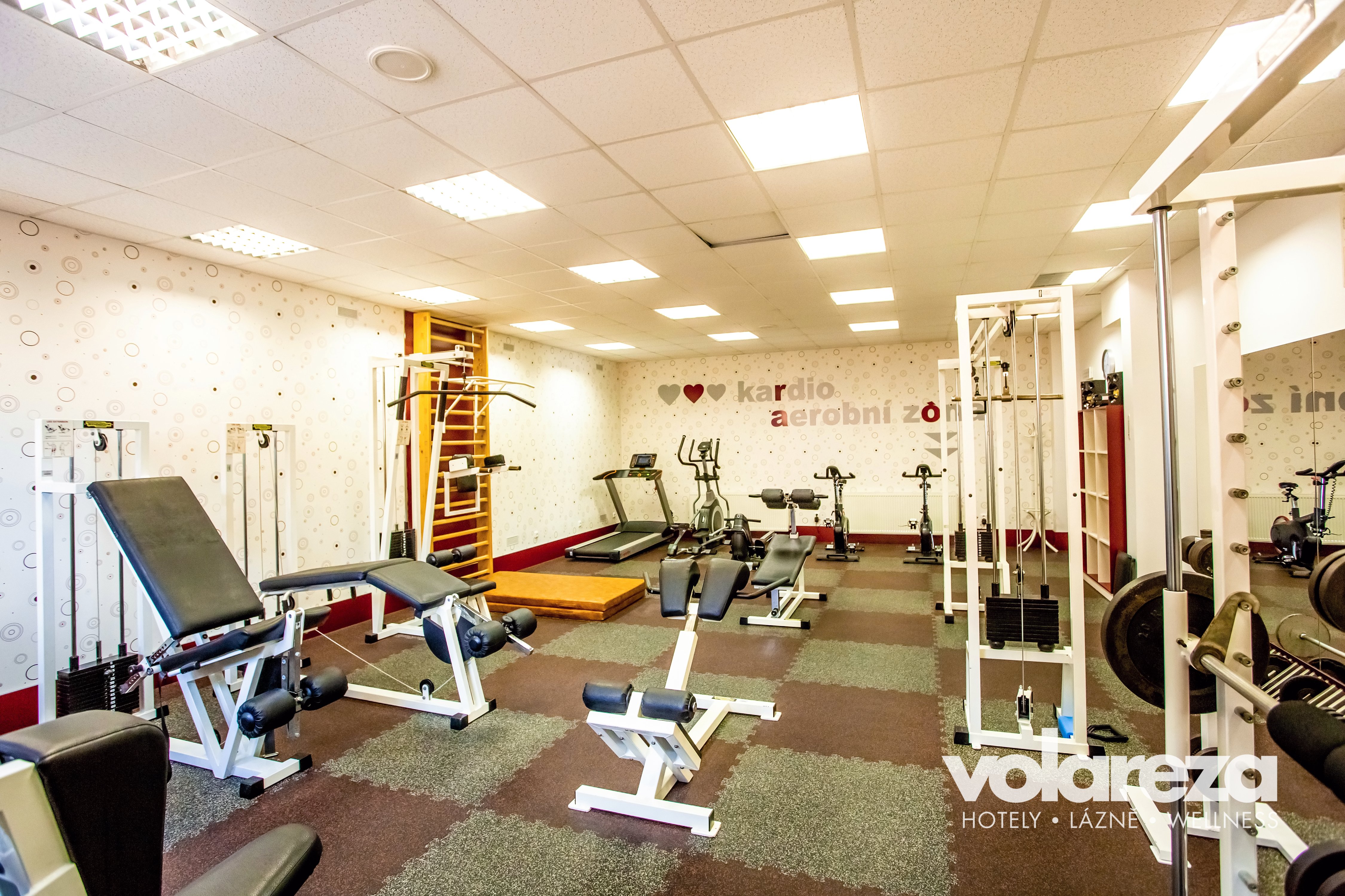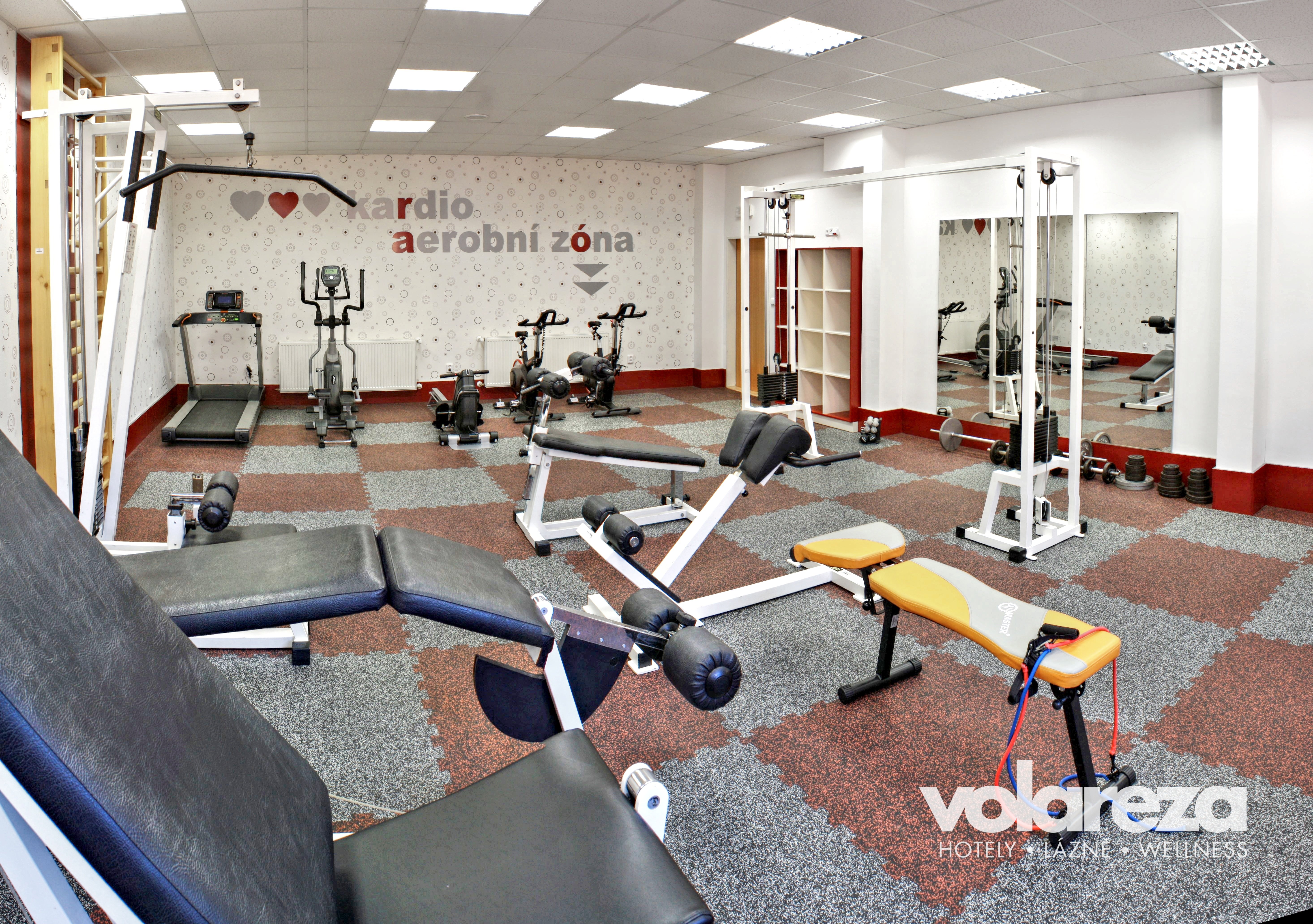 Finesszentrum mit einem breiten Angebot von Geräten – Standfahrrad, Rudersimulator, Verstärkmachine und Bänke.